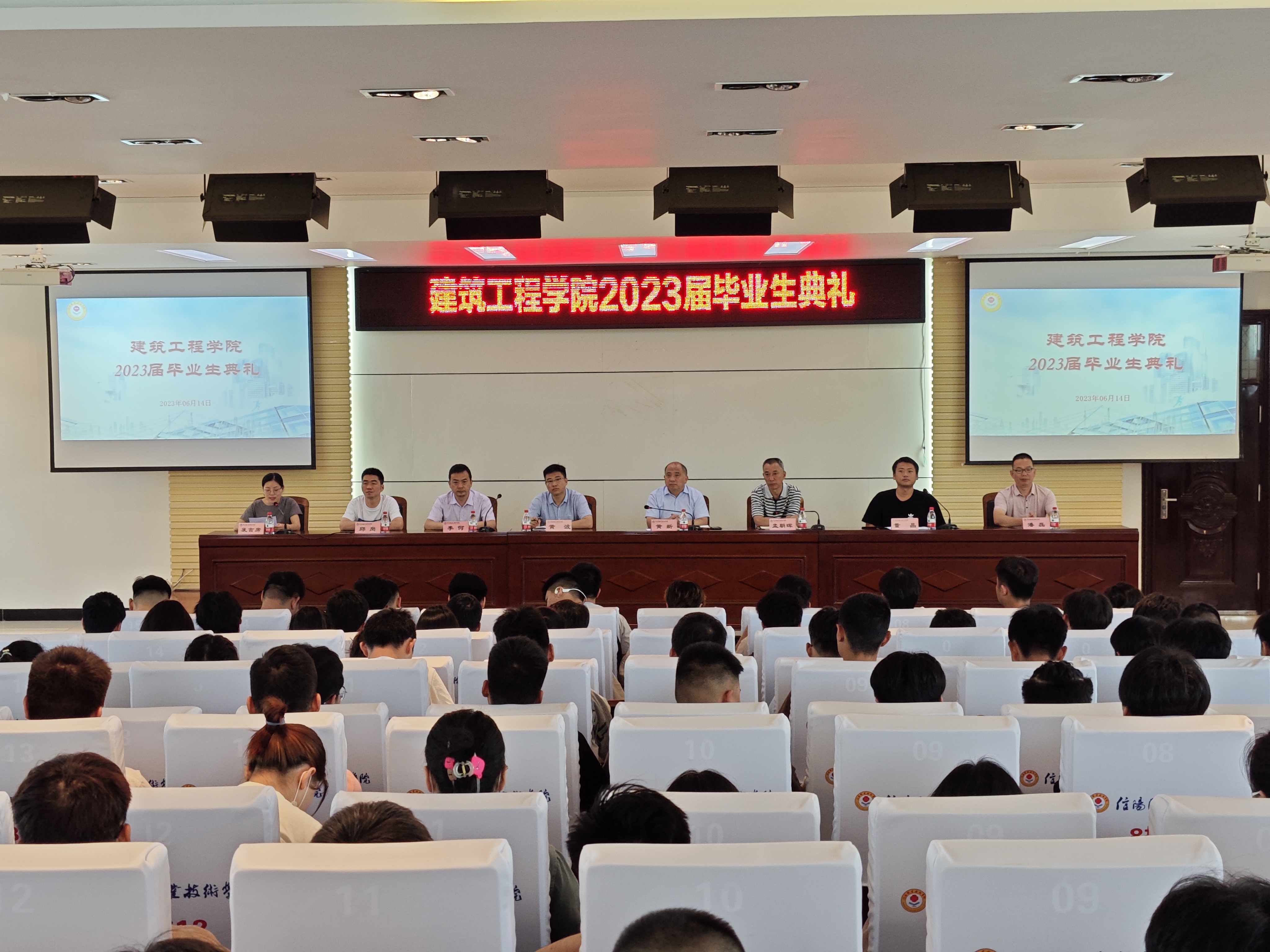 典礼上,黄波宣读了建工公司2023届省级、校级优秀毕业生获得者名单,辅导员代表王文娟老师和毕业生代表余卫华同学分别上台做了发言。