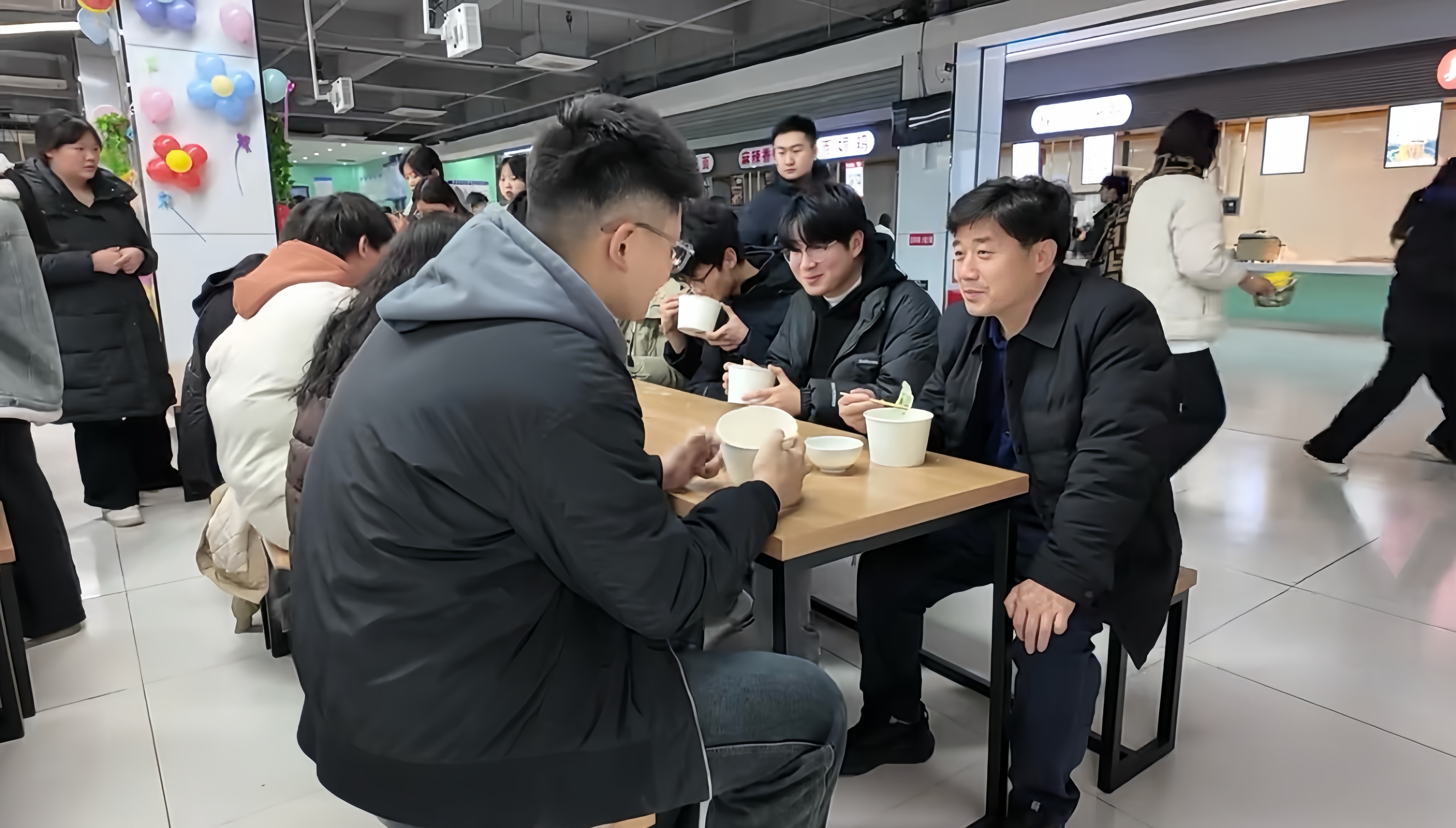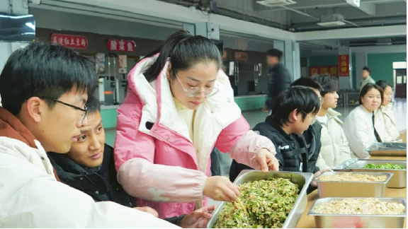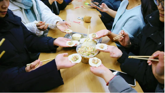 员工在老师的带领下有序入场,一时间,餐厅内人头攒动、热闹非凡。分发饺子皮、分配馅料,一切都在紧锣密鼓地有序进行中,师生们围坐在一起,在欢声笑语中度过了包饺子的温情时刻,轻松和谐的氛围如春风拂面驱散了冬日的寒冷。