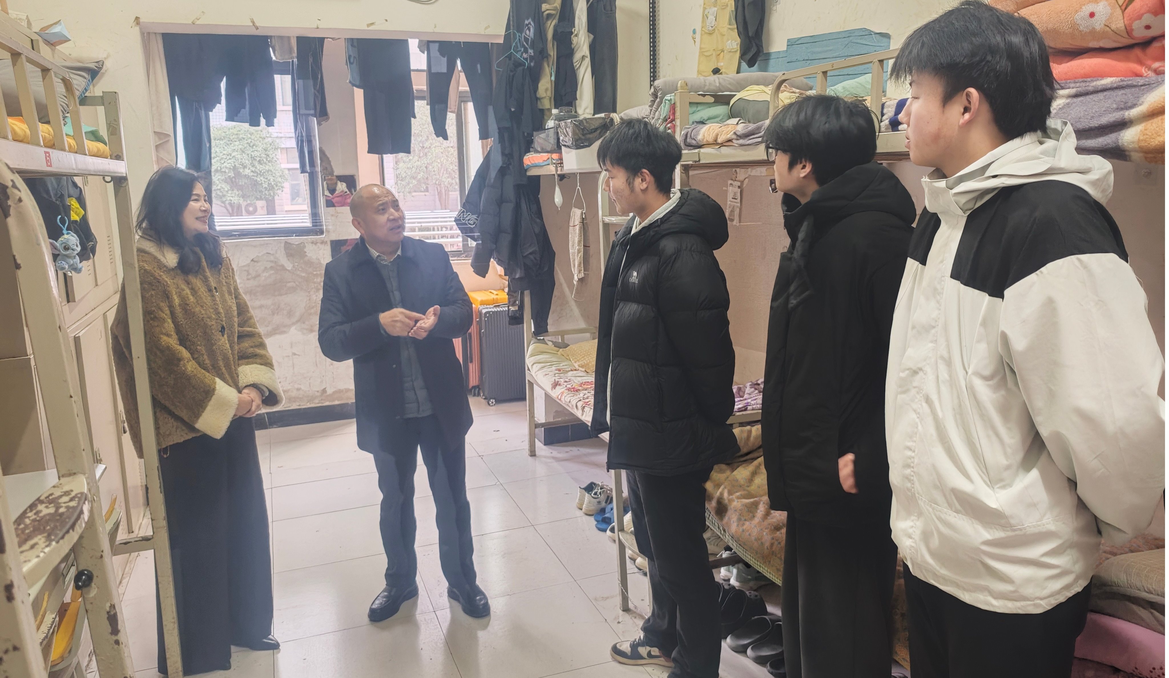 交流过程中,黄新细致询问了同学们的住宿条件、饮食情况及日常生活体验,特别关心食堂餐饮质量、外卖卫生安全以及室友相处状况。他叮嘱同学们注意消防安全,保持良好生活习惯,共同营造安全、文明、和谐的宿舍环境。
