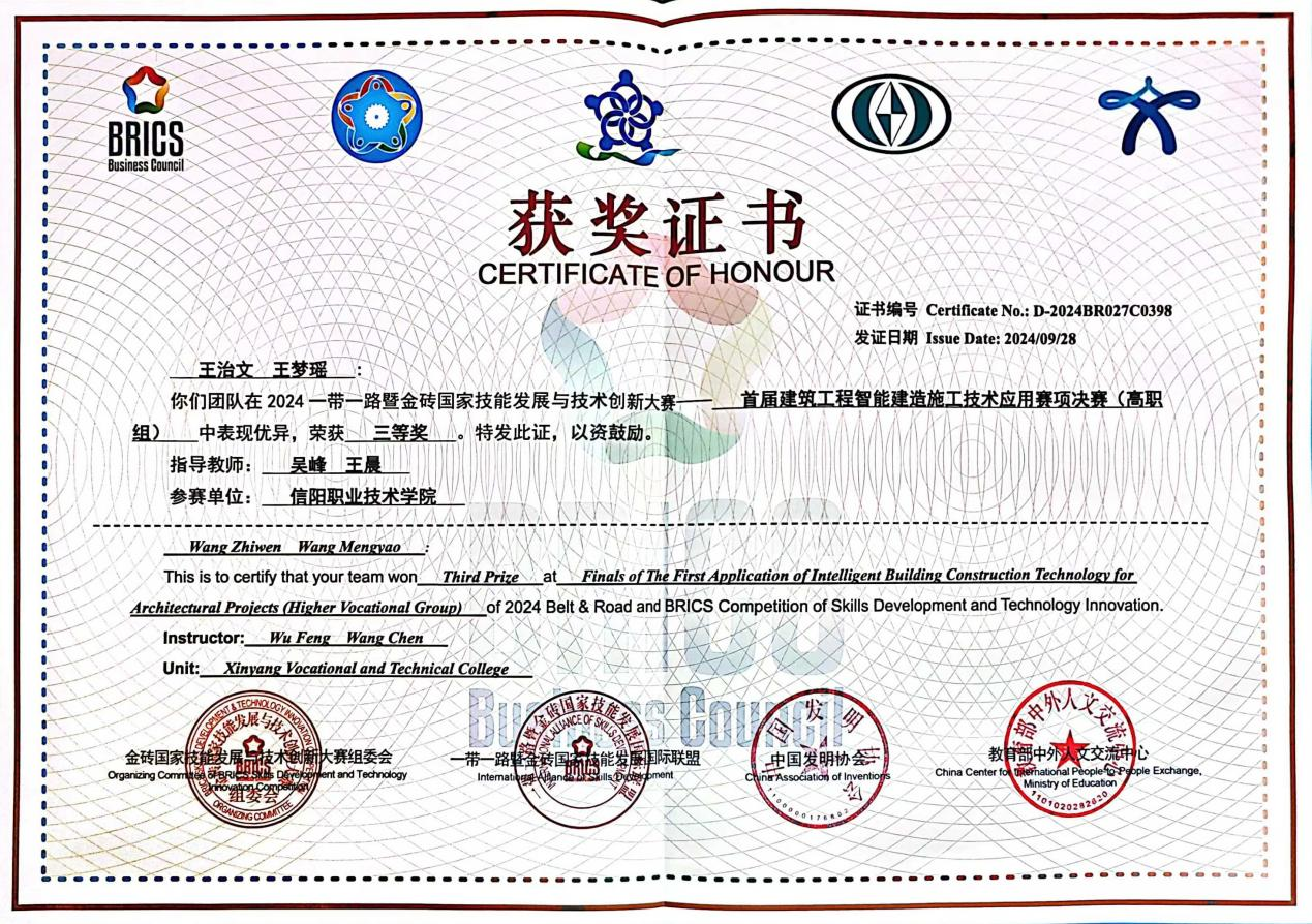 9月26日至28日,在2024年度“一带一路”暨金砖国家技能发展与技术创新大赛首届建筑工程智能建造施工技术应用赛项决赛中,公司yl9193永利23级智能建造技术专业员工王治文,王梦瑶经过激烈竞争,凭借扎实的专业技能和出色的表现,成功取得了全国三等奖的优异成绩