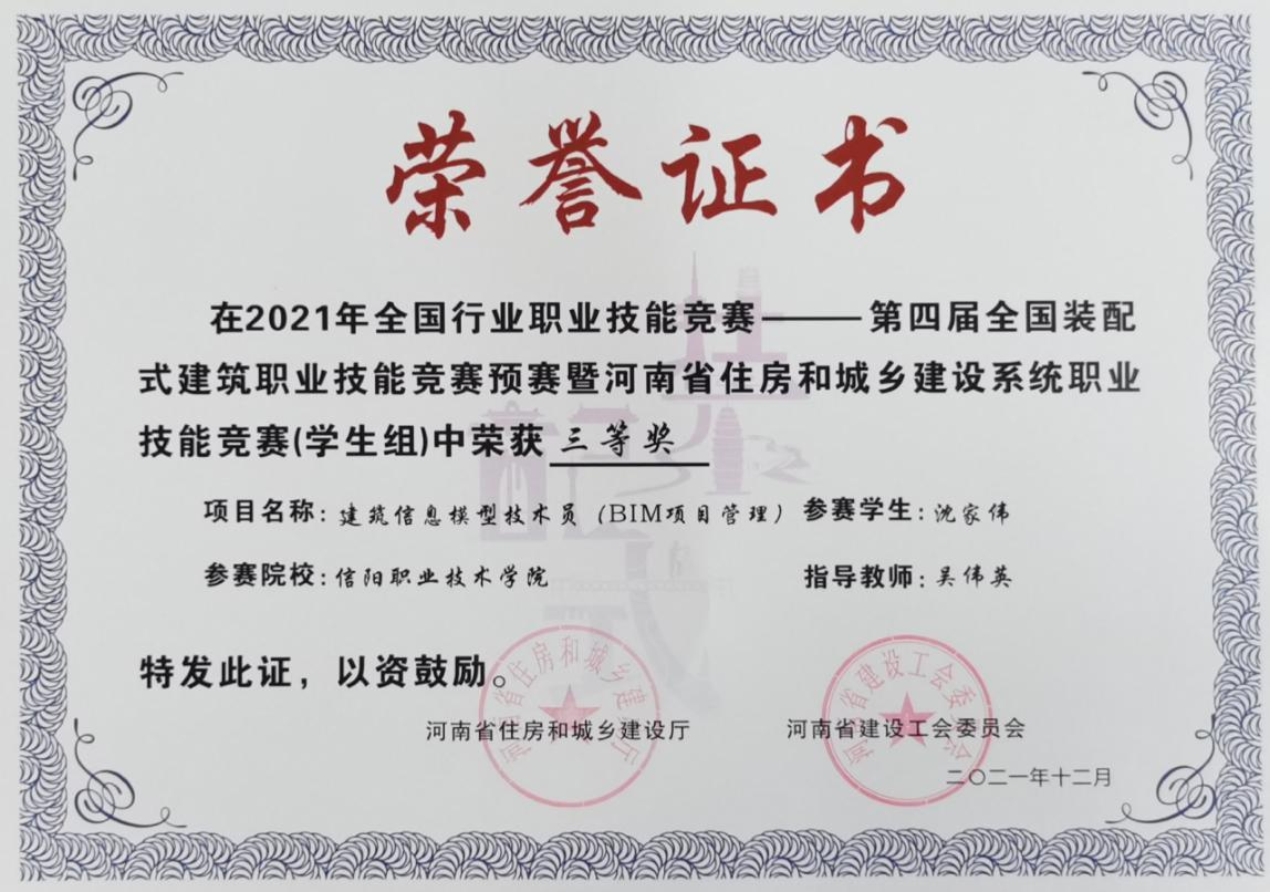 【获得荣誉】2016年河南省建设类院校第一届工程造价技能大赛二等奖;2017第二届河南省工程造价技能大赛三等奖;2018年信阳市中等职业教育技能大赛员工二等奖;2019年河南省第四届工程造价技能大赛BIM5D施工项目成本管理专项一等奖、团队三等奖;2019年全国高等院校BIM应用技能大赛全过程计价专项一等奖、团队三等奖;2021年河南省第六届工程造价技能大赛BIM施工管理专项一等奖、团队三等奖;2021年全国数字建筑创新应用大赛数字建筑工程管理综合赛项团队三等奖。