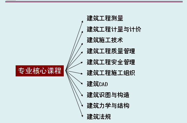 【核心课程】建筑制图与识图、工程测量、建筑设备、房屋建筑学、砌体结构、钢筋砼结构、建筑施工与管理、建筑材料、建筑力学、工程力学、土建工程技术等。