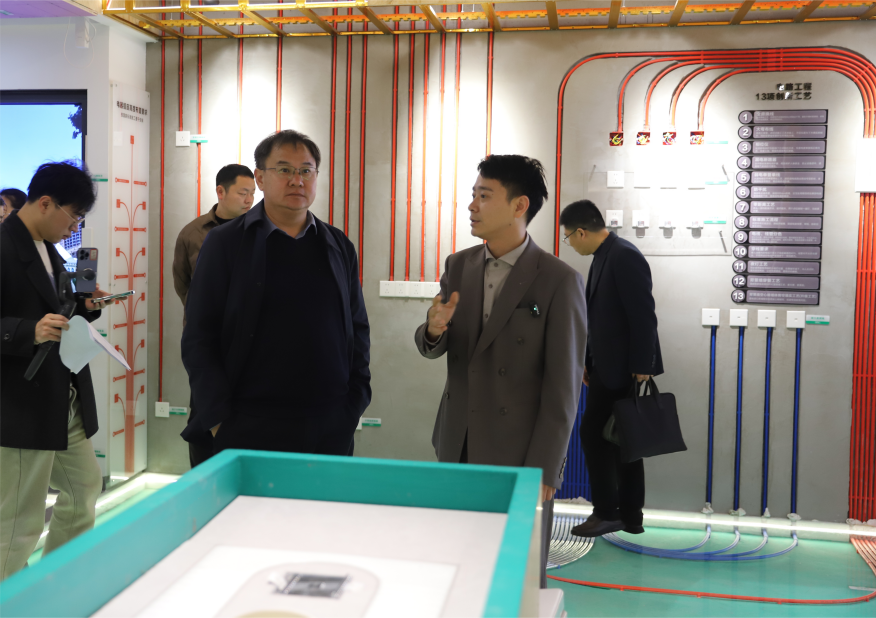 公司董事长李鹏飞的陪同下,郑洪涛一行首先参观了企业的可视化工程管理系统、材料和工艺展示区以及家居样板区,全面了解信阳交换空间装饰有限公司的绿色家装数字化发展进程。调研过程中,双方就人才培养、产学研合作、员工实习就业等工作交换了意见。